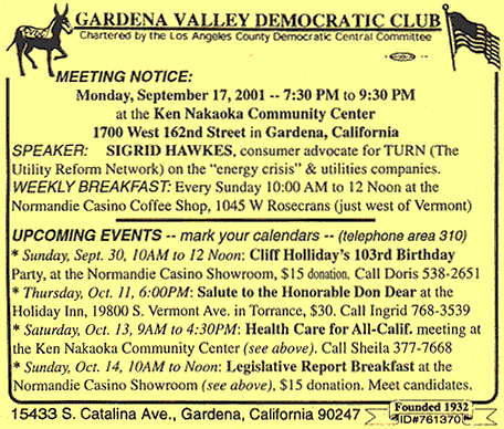 Bruce Dutton, one of our oldest Club members and for decades a confidant to Mayor Don Dear, died on September 15, 2001. Bruce served the City of Gardena for many years in many capacities and was a mainstay at City Council meetings. We will miss him.