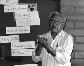 At left, George Ogawa speaking at one of our Sunday Breakfasts at the Spanish Inn in Gardena in the mid-1980s. One of George's many concerns was getting reparations for Americans of Japanese descent who were sent to internment camps during the Second World War. George served in U.S. Army intelligence in China during that war, and was a Professor of Mathematics and worked locally in the defense industry until his retirement in 1985. |