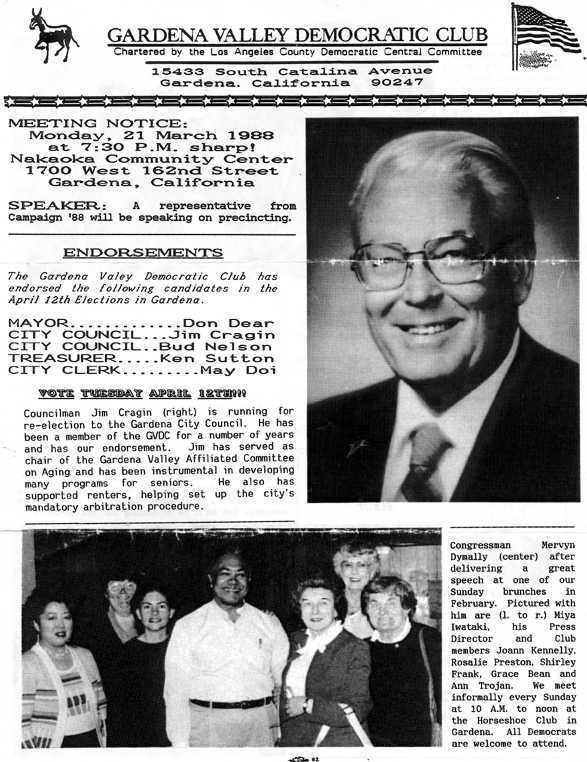 campaign workers that the California Democratic Party used, by the 1990s, to turn the South Bay into a solid Democratic block. In the 1960s, Harmon was President of the North Torrance Democratic Club and was a Director of the California Democratic Council. During the 1980s, Harmon served as Chair of the 51st Assembly District Democratic Committee, in the Beach Cities. Harmon was known to Democrats across the State, and in recent years he mailed his "Postcard News" editorial cartoons to friends everywhere. He will be missed greatly.