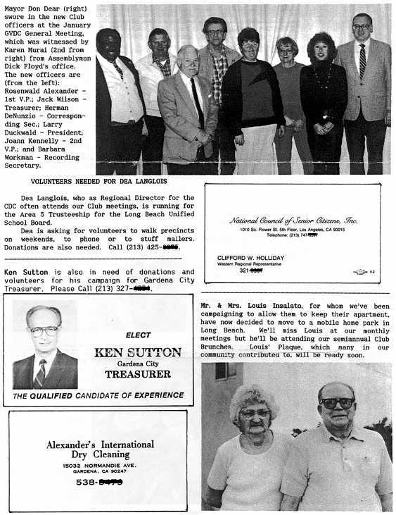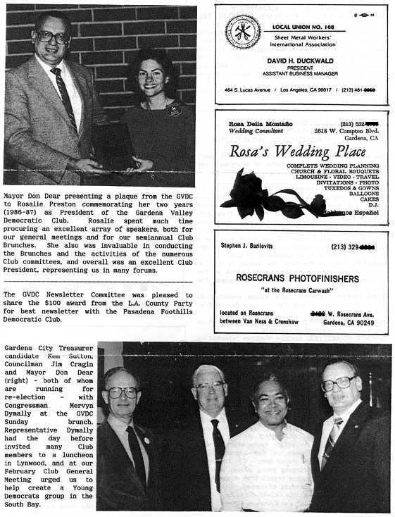 Archie Snow, 79, the former Redondo Beach City Councilman and longtime Gardena Valley Democratic Club member, died on February 27, 1998. Archie led efforts to clean up Redondo Beach politics in the 1970s before being elected to the City Council. Several years ago he ran unsuccessfully for Mayor, but he remained a leader in Democratic politics. Our condolences to his wife Eva and to his family. We will all miss a very colorful politician.
