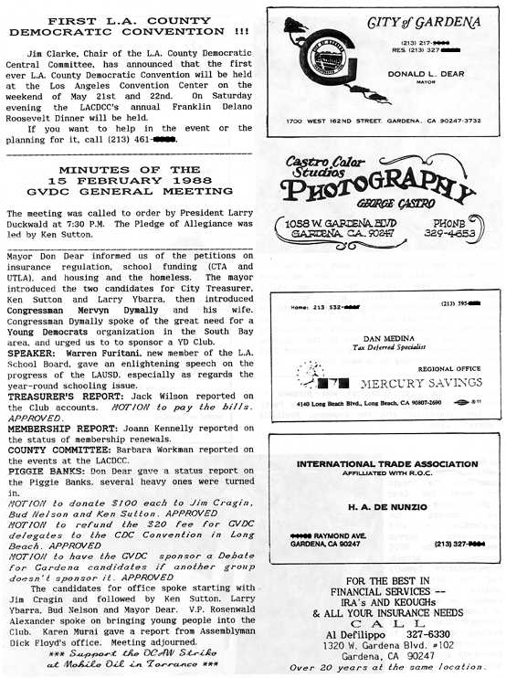 Additional nominations can be made from the floor by any Club members. In order to vote, you must be a current, paid-up Club member. To vote, new members must have been approved at a General Membership meeting at least 28 days earlier. Your 1998 Gardena Valley Democratic Club membership card is proof of membership, or you can get proof at the table outside the meeting hall.